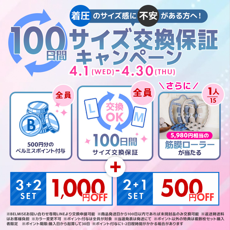 今回のキャンペーンでは、複数枚セットのご購入者様全員を対象に、購入後100日間のサイズ交換保証をご用意しました。届いてから100日間、もしサイズが合わなければ交換できます。