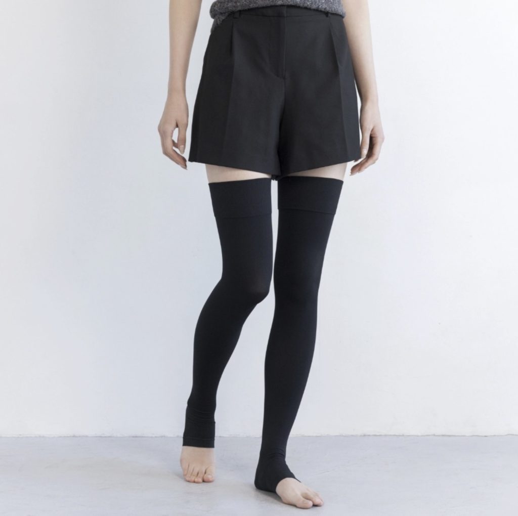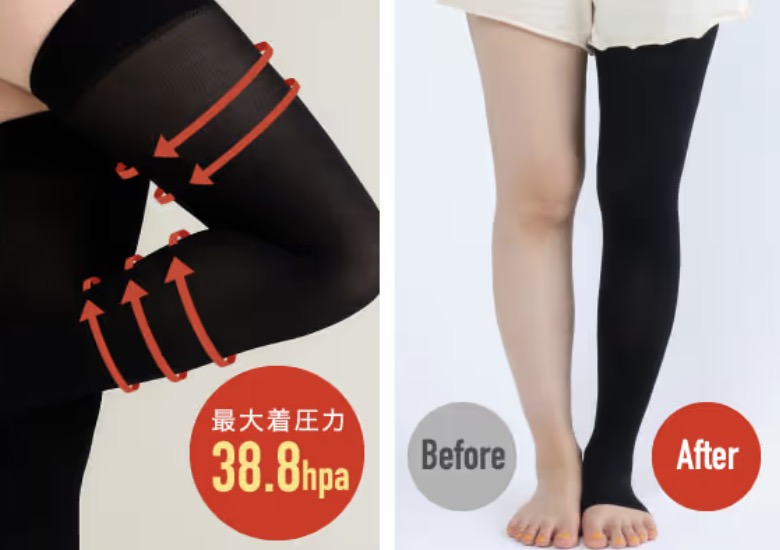 脚の付け根から足先までを覆い、つま先はオープントゥ仕様のため、締め付け感を抑えつつ脚全体をサポートします。
