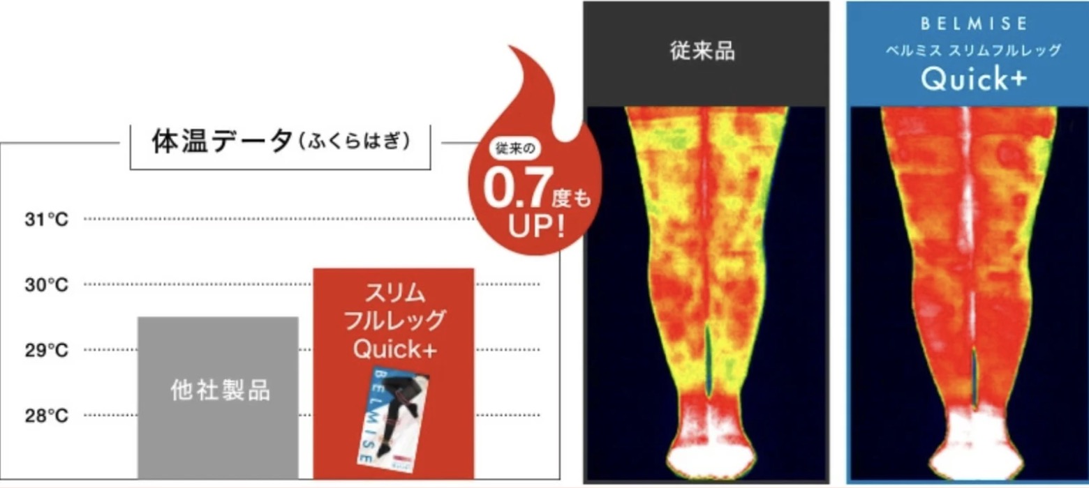 実際の体温データ(ふくらはぎ)では、従来品と比べて表面温度が約0.7℃高くなったのが確認されています。強い着圧だけに頼らず、温かさをプラスしたケアを取り入れたい方にも向いている仕様です。