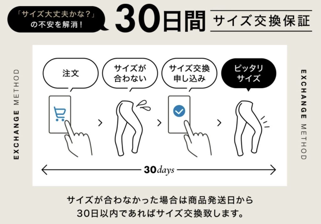 スリムフルレッグ Quick+は、サイズが不安な人向けに30日間サイズ交換保証が付いています。