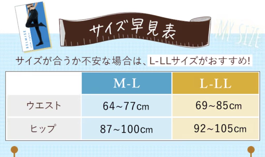 ベルミススリムタイツは、M-L・L-LLの2サイズ展開です。ウエストとヒップのサイズを目安に、サイズ表と照らし合わせて選びましょう。